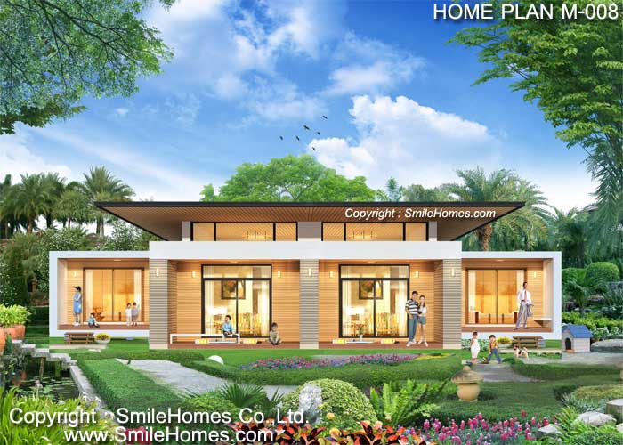 บ้านสไตล์ Modern เป็นแบบบ้านอยู่สบาย ใกล้ชิดธรรมชาติ เน้นการประหยัดพลังงาน เป็นบ้านเล่นระดับ ด้านหน้ายกระดับจากพื้นดิน 0.50 ม. ด้านหลังยกระดับจากพื้นดิน 1.00 ม. ใช้เป็นบ้านพักอาศัย, เป็น Home Office, เป็นเรือนพักผ่อนในสวน, เรือนริมน้ำ, เรือนรับรอง หรือทำเป็น Resort สำหรับให้เช่าได้ : เป็นบ้านชั้นเดียว มี 2 ห้องนอน 3 ห้องน้ำ รูปทรงภายนอกเป็นสไตล์ Modern ดูทันสมัย สวยงาม หลังคาเป็น Metal Sheet ที่มีช่องแสง Sky-Light ด้านบน ด้านหน้าเป็นเฉลียงนั่งเล่น ภายในเป็นส่วนโถงรับแขก และห้องนั่งเล่นขนาดใหญ่ ด้านในเล่นระดับ ยกพื้นสูงเป็ส่วนทานอาหาร มีห้องนอน 2 ห้อง พร้อมห้องน้ำในตัว และเฉลียงส่วนตัว ด้านหลังมีส่วนเตรียมอาหาร Pantry และห้องน้ำ พร้อมส่วนซักล้างด้านหลัง ที่ใช้เป็นส่วนครัวไทยได้ ชั้นล่าง หลังคา