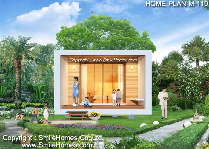บ้านสไตล์ Modern เป็นแบบบ้านอยู่สบาย ใกล้ชิดธรรมชาติ เน้นการประหยัดพลังงาน เป็นบ้านยกระดับจากพื้นดิน 1.00 ม. ใช้เป็นบ้านพักอาศัย, เป็น Home Office, เป็นเรือนพักผ่อนในสวน, เรือนริมน้ำ, เรือนรับรอง หรือทำเป็น Resort สำหรับให้เช่าได้ : เป็นบ้านชั้นเดียว มี 1 ห้องนอน 1 ห้องน้ำ รูปทรงภายนอกเป็นสไตล์ Modern ดูทันสมัย สวยงาม ด้านหน้าเป็นเฉลียงนั่งเล่น ภายในเป็นส่วนห้องพัก สามารถวางเตียงนอน ชุดโซฟา โต๊ะทานอาหาร ด้านหลังมีส่วนเตรียมอาหาร Pantry และห้องน้ำ พร้อมส่วนซักล้างด้านหลัง ชั้นล่าง