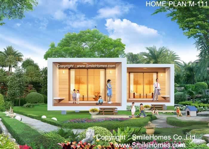 บ้านสไตล์ Modern เป็นแบบบ้านอยู่สบาย ใกล้ชิดธรรมชาติ เน้นการประหยัดพลังงาน เป็นบ้านยกระดับจากพื้นดิน 1.00 ม. ใช้เป็นบ้านพักอาศัย, เป็น Home Office, เป็นเรือนพักผ่อนในสวน, เรือนริมน้ำ, เรือนรับรอง หรือทำเป็น Resort สำหรับให้เช่าได้ : เป็นบ้านชั้นเดียว มี 1 ห้องนอน 1 ห้องน้ำ รูปทรงภายนอกเป็นสไตล์ Modern ดูทันสมัย สวยงาม ด้านหน้าเป็นเฉลียงนั่งเล่น ภายในเป็นส่วนโถงรับแขก สามารถวางชุดโซฟา โต๊ะทานอาหาร มีห้องนอน 1 ห้อง ด้านหลังมีส่วนเตรียมอาหาร Pantry และห้องน้ำ พร้อมส่วนซักล้างด้านหลัง ชั้นล่าง