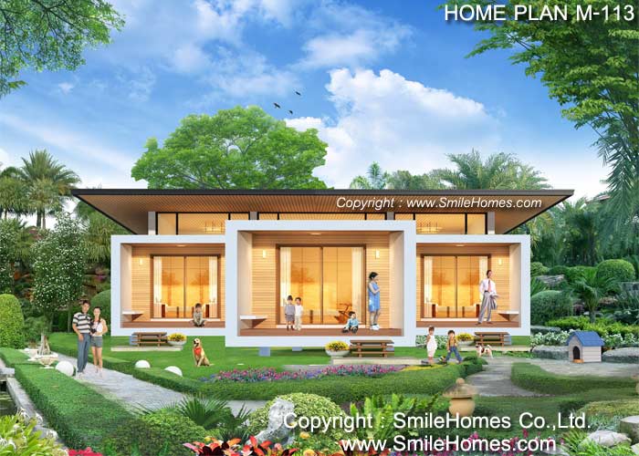 บ้านสไตล์ Modern เป็นแบบบ้านอยู่สบาย ใกล้ชิดธรรมชาติ เน้นการประหยัดพลังงาน เป็นบ้านยกระดับจากพื้นดิน 1.00 ม. ใช้เป็นบ้านพักอาศัย, เป็น Home Office, เป็นเรือนพักผ่อนในสวน, เรือนริมน้ำ, เรือนรับรอง หรือทำเป็น Resort สำหรับให้เช่าได้ : เป็นบ้านชั้นเดียว มี 2 ห้องนอน 1 ห้องน้ำ รูปทรงภายนอกเป็นสไตล์ Modern ดูทันสมัย สวยงาม หลังคาเป็น Metal Sheet ที่มีช่องแสง Sky-Light ด้านบน ด้านหน้าเป็นเฉลียงนั่งเล่น ภายในเป็นส่วนโถงรับแขก สามารถวางชุดโซฟา โต๊ะทานอาหาร มีห้องนอน 2 ห้อง ด้านหลังมีส่วนเตรียมอาหาร Pantry และห้องน้ำ พร้อมส่วนซักล้างด้านหลัง ชั้นล่าง หลังคา