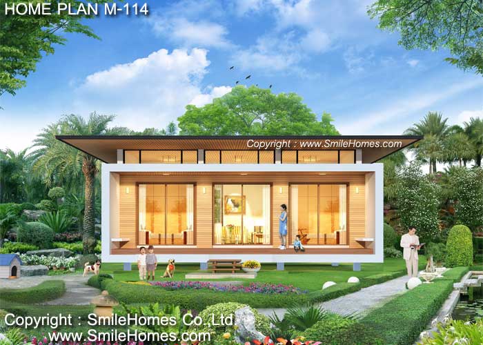 บ้านสไตล์ Modern เป็นแบบบ้านอยู่สบาย ใกล้ชิดธรรมชาติ เน้นการประหยัดพลังงาน เป็นบ้านยกระดับจากพื้นดิน 1.00 ม. ใช้เป็นบ้านพักอาศัย, เป็น Home Office, เป็นเรือนพักผ่อนในสวน, เรือนริมน้ำ, เรือนรับรอง หรือทำเป็น Resort สำหรับให้เช่าได้ : เป็นบ้านชั้นเดียว มี 2 ห้องนอน 2 ห้องน้ำ รูปทรงภายนอกเป็นสไตล์ Modern ดูทันสมัย สวยงาม หลังคาเป็น Metal Sheet ที่มีช่องแสง Sky-Light ด้านบน ด้านหน้าเป็นเฉลียงนั่งเล่น ภายในเป็นส่วนโถงรับแขก สามารถวางชุดโซฟา โต๊ะทานอาหาร มีห้องนอนใหญ่ พร้อมส่วนแต่งตัว และห้องน้ำส่วนตัวภายใน และ ห้องนอน 2 ด้านหลังมีส่วนเตรียมอาหาร Pantry และห้องน้ำ พร้อมส่วนซักล้างด้านหลัง ชั้นล่าง หลังคา