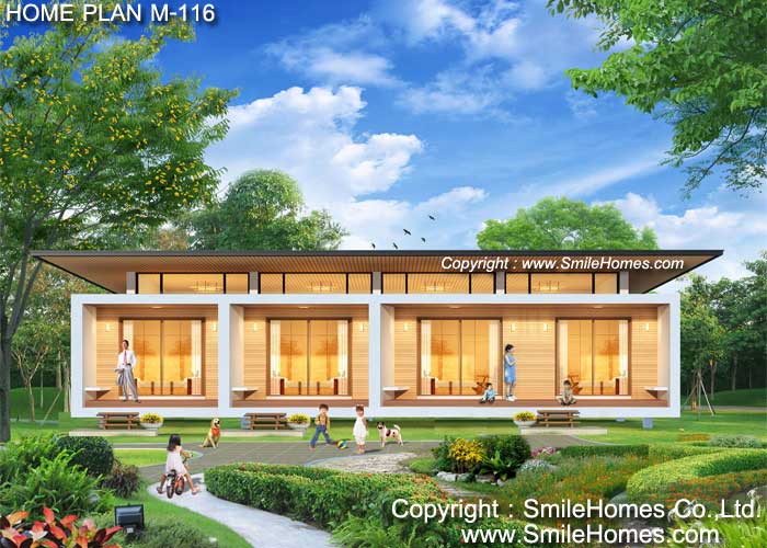 บ้านสไตล์ Modern เป็นแบบบ้านอยู่สบาย ใกล้ชิดธรรมชาติ เน้นการประหยัดพลังงาน เป็นบ้านยกระดับจากพื้นดิน 1.00 ม. ใช้เป็นบ้านพักอาศัย, เป็น Home Office, เป็นเรือนพักผ่อนในสวน, เรือนริมน้ำ, เรือนรับรอง หรือทำเป็น Resort สำหรับให้เช่าได้ : เป็นบ้านชั้นเดียว มี 2 ห้องนอน 2 ห้องน้ำ รูปทรงภายนอกเป็นสไตล์ Modern ดูทันสมัย สวยงาม หลังคาเป็น Metal Sheet ที่มีช่องแสง Sky-Light ด้านบน ด้านหน้าเป็นเฉลียงนั่งเล่น ภายในเป็นส่วนโถงรับแขก สามารถวางชุดโซฟา โต๊ะทานอาหาร มีห้องนอนใหญ่ พร้อมส่วนแต่งตัว แบบ Walk-In Closet และห้องน้ำส่วนตัวภายใน และห้องนอนขนาดกลางอีก 1 ห้อง มีห้องทำงาน หรือ Study Room พร้อมห้องครัว และส่วนเตรียมอาหาร Pantry และห้องน้ำ พร้อมส่วนซักล้างด้านหลัง ชั้นล่าง หลังคา