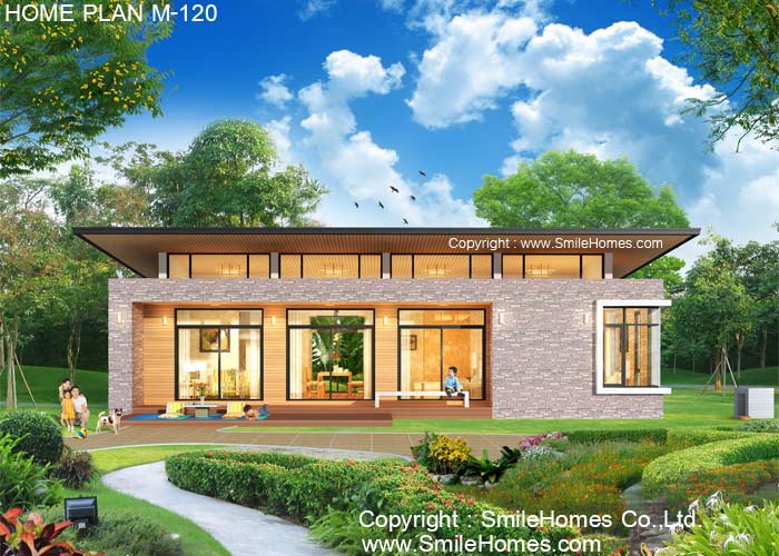 บ้านสไตล์ Modern เป็นแบบบ้านอยู่สบาย ใกล้ชิดธรรมชาติ เน้นการประหยัดพลังงาน เป็นบ้านยกระดับจากพื้นดิน 0.50 ม. ใช้เป็นบ้านพักอาศัย, เป็นเรือนพักผ่อนในสวน หรือริมเชิงเขา, เรือนริมน้ำ, เรือนรับรอง หรือทำเป็น Resort สำหรับให้เช่าได้ บ้านชั้นเดียว มี 2 ห้องนอน 2 ห้องน้ำ รูปทรงภายนอกเป็นสไตล์ Modern ดูทันสมัย สวยงาม ตกแต่งผิวภายนอกด้วยหินธรรมชาติ เป็นบ้านแบบยกฝ้าเพดานสูงถึง 3.8 ม. มีช่องแสง Sky-Light ด้านบน หลังคาเป็น Metal Sheet ที่ดูทันสมัย คลุมรอบตัวบ้านเพื่อกันแดดกันฝน ด้านหน้าเป็นเฉลียงนั่งเล่น นอกชานขนาดใหญ่ ภายในมีส่วนรับแขกโปร่งโล่ง ต่อเนื่องกับ ส่วนทานอาหาร และส่วนเตรียมอาหาร Pantry มีห้องนอนใหญ่ พร้อมห้องน้ำในตัว และห้องนอนขนาดกลางอีก 1 ห้อง พร้อมส่วนครัวไทยด้านหลังแบบเปิดโล่ง มีหลังคาคลุม ชั้นล่าง