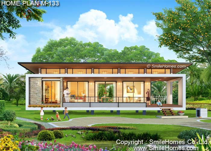 บ้านสไตล์ Modern เป็นแบบบ้านอยู่สบาย ใกล้ชิดธรรมชาติ เน้นการประหยัดพลังงาน เป็นบ้านยกระดับจากพื้นดิน 1.00 ม. ใช้เป็นบ้านพักอาศัย, เป็น Home Office, เป็นเรือนพักผ่อนในสวน, เรือนริมน้ำ, เรือนรับรอง หรือทำเป็น Resort สำหรับให้เช่าได้ : เป็นบ้านชั้นเดียว มี 2 ห้องนอน 2 ห้องน้ำ รูปทรงภายนอกเป็นสไตล์ Modern ดูทันสมัย สวยงาม เป็นบ้านแบบยกฝ้าเพดานสูงถึง 3.6 ม. มีช่องแสง Sky-Light ด้านบน หลังคาเป็น Metal Sheet ที่ดูทันสมัย คลุมรอบตัวบ้านเพื่อกันแดดกันฝน ด้านหน้าเป็นเฉลียงนั่งเล่น นอกชานขนาดใหญ่ ภายในมีส่วนรับแขกโปร่งโล่ง ต่อเนื่องกับ ส่วนทานอาหาร และส่วนเตรียมอาหาร Pantry มีห้องนอนใหญ่ พร้อมส่วนแต่งตัวแบบ Walk-In Closet และห้องน้ำในตัว และห้องนอนขนาดกลางอีก 2 ห้อง พร้อมส่วนซักล้างด้านหลัง ชั้นล่าง