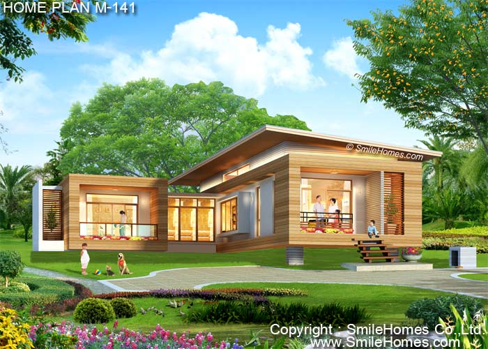 บ้านสไตล์ Modern เป็นแบบบ้านอยู่สบาย ใกล้ชิดธรรมชาติ เน้นการประหยัดพลังงาน เป็นบ้านยกระดับจากพื้นดิน 1.00 ม. สามารถสร้างบนเนินเขาได้ ใช้เป็นบ้านพักอาศัย, เป็น Home Office, เป็นเรือนพักผ่อนในสวน, เรือนริมน้ำ, เรือนรับรอง หรือทำเป็น Resort สำหรับให้เช่าได้ : เป็นบ้านชั้นเดียว มี 2 ห้องนอน 3 ห้องน้ำ รูปทรงภายนอกเป็นสไตล์ Modern ดูทันสมัย สวยงาม ด้านหน้าเป็นเฉลียงนั่งเล่นนอกชานขนาดใหญ่ ภายในเป็นส่วนโถงรับแขกโปร่งโล่ง สามารถวางชุดโซฟา โต๊ะทานอาหาร มีห้องนอนใหญ่ พร้อมส่วนแต่งตัวแบบ Walk-In Closet และห้องน้ำส่วนตัวภายใน มี ห้องนอน 2 พร้อมห้องน้ำส่วนตัว มีส่วนเตรียมอาหาร Pantry และห้องครัวเป็นสัดส่วน และห้องน้ำส่วนกลาง พร้อมส่วนซักล้างด้านหลัง ชั้นล่าง หลังคา