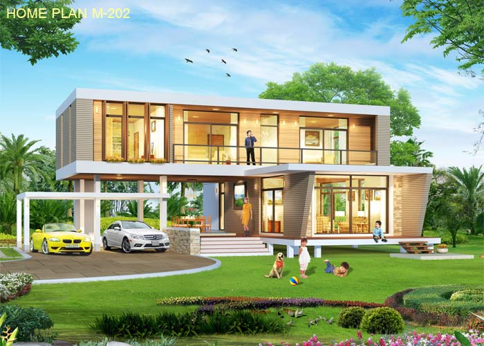 บ้านสไตล์ Modern เป็นแบบบ้านอยู่สบาย ใกล้ชิดธรรมชาติ เน้นการประหยัดพลังงาน เป็นบ้านยกระดับ ใต้ถุนโล่ง ใช้เป็นบ้านพักอาศัย, เป็นเรือนพักผ่อนในสวน, เรือนริมน้ำ, เรือนรับรอง หรือทำเป็น Resort สำหรับให้เช่าได้ เป็นบ้าน 2 ชั้น มี 3 ห้องนอน 3 ห้องน้ำ ที่จอดรถ 2 คัน รูปทรงภายนอกเป็นสไตล์ Modern ดูทันสมัย สวยงาม โปร่งโล่ง ชั้นล่างเป็นใต้ถุนโล่ง มีเฉลียงด้านหน้า เล่นระดับโดยการยกพื้นขึ้น มีบันไดทางขึ้น ภายในเป็นห้องรับแขก ห้องทานอาหาร ต่อเนื่องกับ ส่วนเตรียมอาหาร Pantry และส่วนครัว พร้อมห้องน้ำ ด้านนอกเป็นส่วนใต้ถุนโล่ง ขนาดใหญ่ ใช้เป็นส่วนนั่งเล่นนอกชาน หรือใช้เป็นที่ทำงานได้ ชั้นบนมี 3 ห้องนอน มีห้องนอนใหญ่ พร้อมห้องน้ำในตัว และห้องนอน 2 กับห้องนอน 3 เป็นห้องนอนขนาดกลาง ด้านหลังเป็นทางเดิน สามารถทำเป็นส่วนห้องสมุดขนาดย่อม โดยทำตู้หนังสือขนาดใหญ่ จากพื้นถึงฝ้าเพดานได้ และมีระเบียงขนาดยาวด้านหน้า และราวระเบียงกันตก ทำเป็นกระจกนิรภัยแบบใส เพื่อความโปร่งโล่ง ด้านนอกเป็นระเบียงขนาดใหญ่ ใช้เป็นที่นั่งเล่นรับลม นอกชาน หรือใช้สังสรรค์สำหรับครอบครัวได้ ชั้นล่าง ชั้นบน