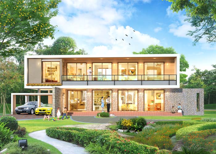 บ้านสไตล์ Modern เป็นแบบบ้านอยู่สบาย ใกล้ชิดธรรมชาติ เน้นการประหยัดพลังงาน เป็นบ้านเล่นระดับ มีส่วนใต้ถุนโล่ง ใช้เป็นบ้านพักอาศัย, เป็นเรือนพักผ่อนในสวน, เรือนริมน้ำ, เรือนรับรอง, บ้านพักริมเชิงเขา หรือทำเป็น Resort สำหรับให้เช่าได้ เป็นบ้าน 2 ชั้น มี 4 ห้องนอน 5 ห้องน้ำ ที่จอดรถ 2 คัน รูปทรงภายนอกเป็นสไตล์ Modern ดูทันสมัย สวยงาม โปร่งโล่ง ตกแต่งผิววัสดุด้วยหินธรรมชาติ ชั้นล่าง มีเฉลียงยาวด้านหน้า ภายในเป็นห้องโถง และรับแขก ห้องทานอาหาร ที่มีเฉลียงส่วนตัว ด้านข้างที่ทำเป็นที่นั่งเล่น และทำบ่อเลี้ยงปลา มีห้องนอนที่ชั้นล่างสำหรับผู้สูงอายุ หรือสำหรับแขก พร้อมห้องน้ำส่วนตัว มีส่วนเตรียมอาหาร Pantry และห้องครัวแยกเป็นสัดส่วน มีส่วนครัวไทยด้านหลัง พร้อมห้องน้ำ มีห้องคนใช้ พร้อมห้องน้ำ และห้องเก็บของหลังที่จอดรถ ชั้นบนมีส่วนนั่งเล่นขนาดใหญ่ และห้องพระแบบกึ่งโปร่ง มีห้องนอนใหญ่ พร้อมส่วนแต่งตัว walk-In Closet ขนาดใหญ่ และห้องน้ำในตัวที่มีสุขภัณฑ์ครบชุด มีห้องนอน 2 ขนาดใหญ่ มีห้องทำงานด้านหลัง ซึ่งสามารถปรับเป็นห้องแต่งตัวแบบ Walk-In Closet สำหรับห้องนอน 2 ได้ และห้องนอน 3 เป็นห้องนอนขนาดกลาง ด้านหลังเป็นทางเดิน สามารถทำเป็นส่วนห้องสมุดขนาดย่อม โดยทำตู้หนังสือขนาดใหญ่ จากพื้นถึงฝ้าเพดานได้ และมีระเบียงยาวด้านหน้า และราวระเบียงกันตก ทำเป็นกระจกนิรภัยแบบใส เพื่อความโปร่งโล่ง ชั้นล่าง - สระว่ายน้ำ ( ขนาด 3.00 x 8.00 ม.) ** ในแบบชุดมาตรฐานจะไม่มีสระว่ายน้ำ บริเวณส่วนนี้สามารถทำเป็นจัดสวนแทนได้ ** ชั้นบน