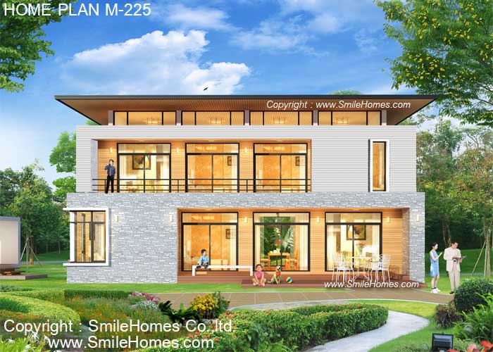 บ้านสไตล์ Modern เป็นแบบบ้านอยู่สบาย ใกล้ชิดธรรมชาติ เน้นการประหยัดพลังงาน เป็นบ้านยกระดับจากพื้นดิน 0.50 ม. ใช้เป็นบ้านพักอาศัย, เป็นเรือนพักผ่อนในสวน หรือริมเชิงเขา, เรือนริมน้ำ, เรือนรับรอง หรือทำเป็น Resort สำหรับให้เช่าได้ เป็นบ้าน 2 ชั้น มี 5 ห้องนอน 7 ห้องน้ำ รูปทรงภายนอกเป็นสไตล์ Modern ดูทันสมัย สวยงาม ชั้นล่างตกแต่งผิวภายนอกด้วยหินธรรมชาติ ชั้นบนแต่งผิวด้วนแผ่นไม้เทียม และยกฝ้าเพดานสูงถึง 3.6 ม. มีช่องแสง Sky-Light ด้านบน หลังคาเป็น Metal Sheet ที่ดูทันสมัย คลุมรอบตัวบ้านเพื่อกันแดดกันฝน ชั้นล่างด้านหน้าเป็นเฉลียงนั่งเล่น นอกชานขนาดใหญ่ ภายในมีส่วนรับแขกโปร่งโล่ง ต่อเนื่องกับ ส่วนทานอาหาร มีห้องนั่งเล่น มีห้องนอน พร้อมห้องน้ำในตัว และส่วนเตรียมอาหาร Pantry พร้อมส่วนครัวด้านหลัง มีเฉลียงนั่งเล่นนอกชานขนาดใหญ่ด้านหลัง พร้อมส่วนห้องคนใช้ ชั้นบนมีห้องนั่งเล่นขนาดใหญ่ พร้อมห้องสมุด และระเบียงใหญ่ด้านหลัง มีห้องนอนขนาดใหญ่ 3 ห้อง พร้อมห้องน้ำภายใน และห้องนอนขนาดกลางอีก 1 ห้อง พร้อมห้องน้ำส่วนตัว และส่วนทางเดินด้านหลังทำเป็นโถงห้องสมุด ทำเป็นตู้หนังสือขนาดใหญ่ สูงจากพื้นถึงฝ้าเพดานได้