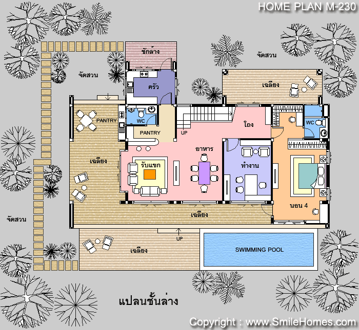 - ในแบบชุดมาตรฐานจะไม่มีส่วนสระว่ายน้ำด้านหน้า ถ้าต้องการแบบพิมพ์เขียวรายละเอียดสระว่ายน้ำ คิดค่าแบบเพิ่ม 20,000 บาท