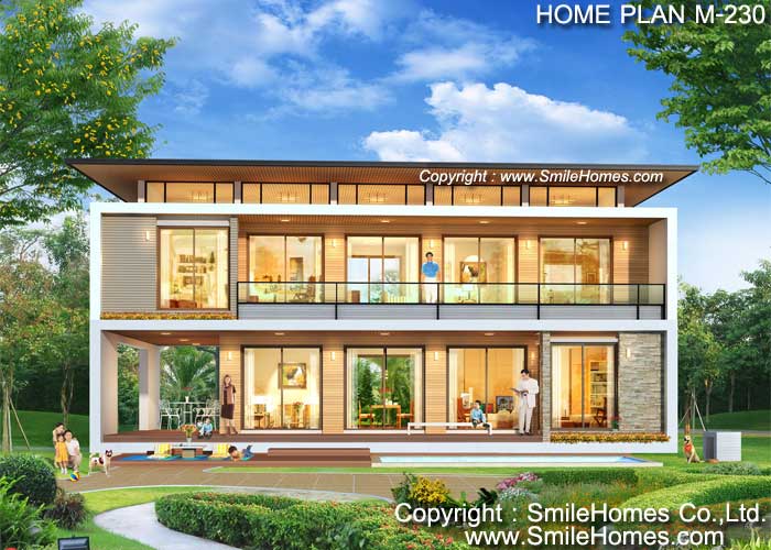 บ้านสไตล์ Modern เป็นแบบบ้านอยู่สบาย ใกล้ชิดธรรมชาติ เน้นการประหยัดพลังงาน เป็นบ้านยกระดับจากพื้นดิน 0.50 ม. ใช้เป็นบ้านพักอาศัย, เป็นเรือนพักผ่อนในสวน หรือริมเชิงเขา, เรือนริมน้ำ, เรือนรับรอง หรือทำเป็น Resort สำหรับให้เช่าได้ เป็นบ้าน 2 ชั้น มี 4 ห้องนอน 5 ห้องน้ำ รูปทรงภายนอกเป็นสไตล์ Modern ดูทันสมัย สวยงาม ตกแต่งผิวภายนอกด้วยหินธรรมชาติ และแผ่นไม้เทียม ชั้นยกฝ้าเพดานสูงถึง 3.5 ม. มีช่องแสง Sky-Light ด้านบน หลังคาเป็น Metal Sheet ที่ดูทันสมัย คลุมรอบตัวบ้านเพื่อกันแดดกันฝน ชั้นล่างด้านหน้าเป็นเฉลียงนั่งเล่น นอกชานขนาดใหญ่ ภายในมีส่วนรับแขกโปร่งโล่ง ต่อเนื่องกับ ส่วนทานอาหาร มีห้องทำงาน มีห้องนอน พร้อมห้องน้ำในตัว และส่วนเตรียมอาหาร Pantry พร้อมส่วนครัวด้านหลัง มีเฉลียงนั่งเล่นนอกชานขนาดใหญ่ด้านหลัง ชั้นบนมีห้องนั่งเล่นขนาดใหญ่ และระเบียงยาวด้านหน้า มีห้องนอนขนาดใหญ่ 3 ห้อง พร้อมห้องน้ำภายใน และส่วนโถงห้องสมุด ทำเป็นตู้หนังสือขนาดใหญ่ สูงจากพื้นถึงฝ้าเพดานได้