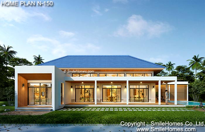 บ้านสไตล์ Modern เป็นแบบบ้านอยู่สบาย ใกล้ชิดธรรมชาติ เน้นการประหยัดพลังงาน เป็นบ้านยกระดับจากพื้นดิน 0.60 ม. ใช้เป็นบ้านพักอาศัย หรือเป็น Home Office ได้ : เป็นบ้านชั้นเดียว มี 4 ห้องนอน 4 ห้องน้ำ รูปทรงภายนอกเป็นสไตล์ Modern ดูทันสมัย สวยงาม เป็นบ้านแบบยกฝ้าเพดานสูงถึง 4.20 ม. มีช่องแสง Sky-Light ด้านบน หลังคาเป็น Metal Sheet ที่ดูทันสมัย คลุมรอบตัวบ้านเพื่อกันแดดกันฝน ด้านหน้าเป็นเฉลียงนั่งเล่น นอกชานขนาดใหญ่ ภายในมีส่วนรับแขกโปร่งโล่ง ต่อเนื่องกับ ส่วนทานอาหาร และส่วนทำงาน มีห้องนอนขนาดใหญ่ พร้อมส่วนแต่งตัวแบบ Walk-In Closet 2 ห้อง และห้องน้ำในตัว และห้องนอนขนาดกลางอีก 2 ห้อง มีห้องครัว ห้องน้ำส่วนกลาง และส่วนซักล้างด้านหลัง ชั้นล่าง - สระว่ายน้ำ ( ขนาด 5.00 x 7.80 ม.) ** ในแบบชุดมาตรฐานจะไม่มีสระว่ายน้ำ บริเวณส่วนนี้สามารถทำเป็นจัดสวนแทนได้ **