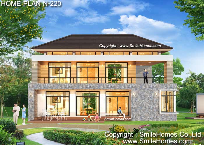 | แบบบ้าน 2 ชั้น N-220 3 ห้องนอน 4 ห้องน้ำ พื้นที่ใช้สอยภายใน 336 ตร.ม. ขนาดตัวบ้านกว้าง 17.20 ม. ลึก 13.50 ม. ที่ดินขนาด 90 ตร.ว.ขึ้นไป ค่าก่อสร้างประมาณ 4.5 - 5.5 ล้านบาท ค่าแบบพิมพ์เขียว 5 ชุดพิเศษ 49,900 บาท ( จากราคาปกติ 120,000 บาท) ค่าจัดส่งฟรี |