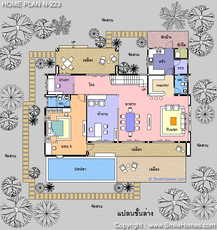 - ในแบบชุดมาตรฐานจะไม่มีส่วนสระว่ายน้ำด้านหน้า ถ้าต้องการแบบพิมพ์เขียวรายละเอียดสระว่ายน้ำ คิดค่าแบบเพิ่ม 20,000 บาท