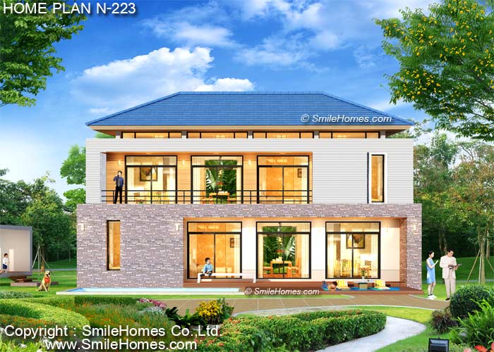 บ้านสไตล์ Neo Modern เป็นแบบบ้านอยู่สบาย ใกล้ชิดธรรมชาติ เน้นการประหยัดพลังงาน เป็นบ้านยกระดับจากพื้นดิน 0.50 ม. ใช้เป็นบ้านพักอาศัย, เป็นเรือนพักผ่อนในสวน หรือริมเชิงเขา, เรือนริมน้ำ, เรือนรับรอง หรือทำเป็น Resort สำหรับให้เช่าได้ เป็นบ้าน 2 ชั้น มี 5 ห้องนอน 5 ห้องน้ำ รูปทรงภายนอกเป็นสไตล์ Neo Modern ดูทันสมัย สวยงาม ชั้นล่างตกแต่งผิวภายนอกด้วยหินธรรมชาติ ชั้นบนแต่งผิวด้วนแผ่นไม้เทียม และยกฝ้าเพดานสูงถึง 3.6 ม. มีช่องแสง Sky-Light ด้านบน หลังคาเป็นทรงปั้นหยา ที่ดูทันสมัย ชั้นล่างด้านหน้าเป็นเฉลียงนั่งเล่น นอกชานขนาดใหญ่ ภายในมีส่วนรับแขกโปร่งโล่ง ต่อเนื่องกับ ส่วนทานอาหาร มีห้องนอน พร้อมห้องน้ำในตัว และส่วนเตรียมอาหาร Pantry พร้อมส่วนครัวด้านหลัง มีเฉลียงนั่งเล่นนอกชานขนาดใหญ่ด้านหลัง ชั้นบนมีห้องนั่งเล่นขนาดใหญ่ และระเบียงใหญ่ด้านข้าง มีห้องนอนขนาดใหญ่ 2 ห้อง ที่มีส่วนแต่งตัว พร้อมห้องน้ำภายใน และห้องนอนขนาดกลางอีก 1 ห้อง พร้อมห้องน้ำส่วนตัว มีห้องพระด้านหลัง และส่วนทางเดินด้านหลังทำเป็นโถงห้องสมุด ทำเป็นตู้หนังสือขนาดใหญ่ สูงจากพื้นถึงฝ้าเพดานได้