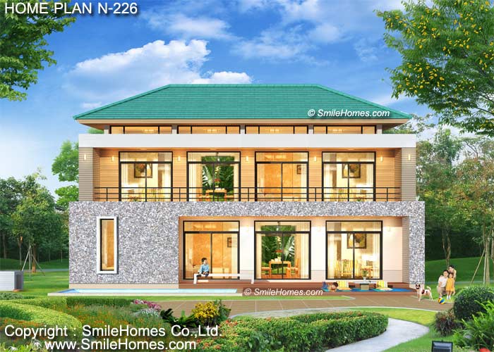 | แบบบ้าน 2 ชั้น N-226 4 ห้องนอน 5 ห้องน้ำ พื้นที่ใช้สอยภายใน 350 ตร.ม. ขนาดตัวบ้านกว้าง 17.20 ม. ลึก 10.70 ม. ที่ดินขนาด 78 ตร.ว.ขึ้นไป ค่าก่อสร้างประมาณ 4.2 - 5.2 ล้านบาท ค่าแบบพิมพ์เขียว 5 ชุดพิเศษ 39,900 บาท ( จากราคาปกติ 120,000 บาท) ค่าจัดส่งฟรี |