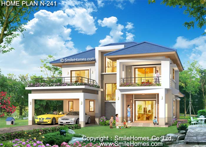 บ้านสไตล์ New Contemporary เป็นแบบบ้านอยู่สบาย ใกล้ชิดธรรมชาติ เน้นการประหยัดพลังงาน - เป็นบ้าน 4 ห้องนอน 4 ห้องน้ำ ที่จอดรถ 2 คัน รูปทรงภายนอกดูทันสมัย สวยงาม โปร่งโล่ง ให้ความรู้สึกร่มรื่นเย็นสบาย มีส่วนชั้นลอยยกสูงพร้อมช่องแสง Sky Light เป็นจุดเด่น เฉลียงด้านหน้ากว้างขวาง ต่อจากส่วนจอดรถ เข้าสู่ภายในซึ่งเป็นห้องรับแขกโปร่งโล่ง ห้องทานอาหาร มีเฉลียงด้านข้างที่เป็นส่วนตัว ห้องครัวเป็นสัดส่วน ต่อเนื่องกับส่วนเตรียมอาหาร Pantry มีห้องนอนสำหรับแขกหรือผู้สูงอายุ พร้อมห้องน้ำส่วนตัวภายวน สามารถปรับเป็นห้องทำงาน หรือห้องโฮมเธียร์เตอร์ได้ ชั้นบนมีห้องนอนใหญ่ พร้อมส่วนแต่งตัวแบบ Walk-In Closet และห้องน้ำในตัว และห้องนอนขนาดกลางอีก 2 ห้อง และห้องน้ำใช้ร่วมกัน มีชั้นลอยทำเป็นห้องพระ และมีระเบียงด้านหน้าห้องนอน 1 ซึ่งเปิดกว้าง และมีระเบียงขนาดใหญ่ด้านหน้า รายละเอียดแบบบ้าน N-241 ชั้นสอง