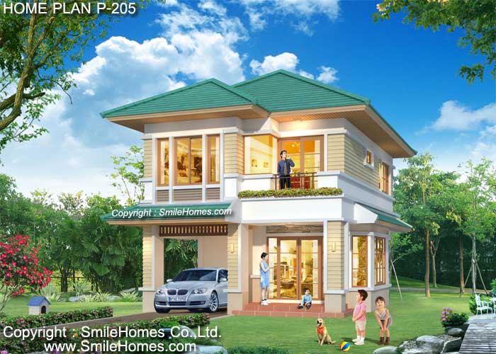 แบบบ้าน P-205 แบบบ้านสไตล์ Contemporary : แบบบ้านอยู่สบาย ใกล้ชิดธรรมชาติ เน้นการประหยัดพลังงาน รูปทรงโดดเด่น สวยงาม มีเอกลักษณ์เฉพาะตัว ให้ความรู้สึกร่มรื่น เป็นบ้าน 4 ห้องนอน 4 ห้องน้ำ ที่จอดรถ 1 คัน จากที่จอดรถ มีเฉลียงด้านหน้า เข้าสู่ภายใน ซึ่งเป็นห้องรับแขกโปร่งโล่ง มี Bay window ที่เป็นหน้าต่างขนาดใหญ่ ต่อเนื่องกับห้องทานอาหาร พร้อมส่วนเตรียมอาหาร Pantry และห้องครัวเป็นสัดส่วน มีห้องนอนสำหรับแขก หรือผู้สูงอายุ ชั้นบนห้องนอนใหญ่ ที่มีห้องน้ำในตัว พร้อมส่วนแต่งตัว แบบ Walk-In C;oset และเฉลียงด้านหน้า มีห้องนอนขนาดใหญ่อีก 2 ห้อง พร้อมห้องน้ำในตัว รายละเอียดแบบบ้าน P-205 ชั้นสอง