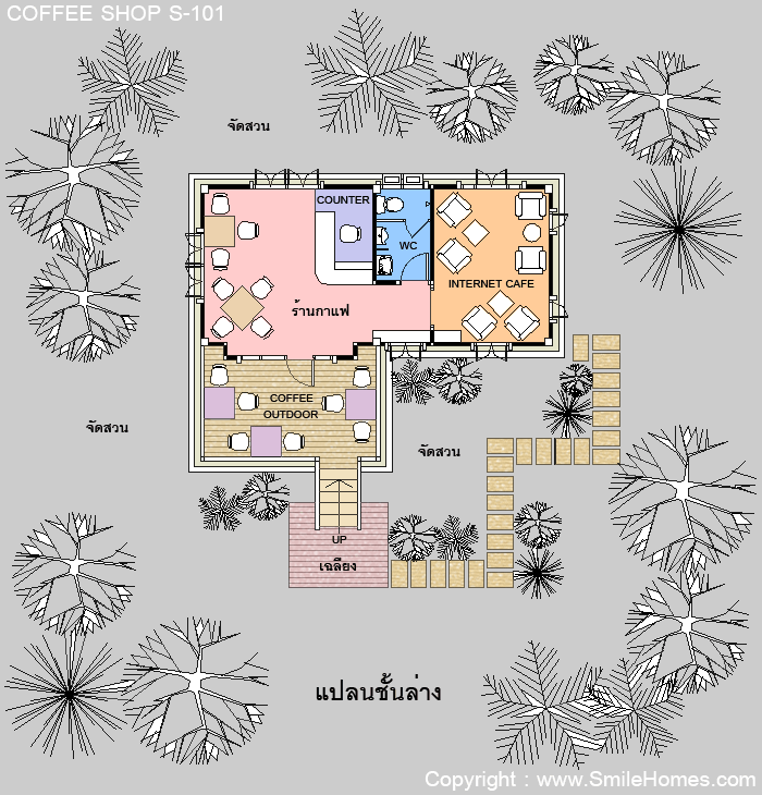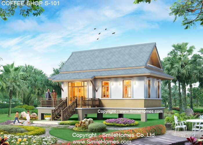 ร้านกาแฟ หรือ Coffee Shop สไตล์ Modern Thai ( สามารถปรับเป็นร้าน Internet Cafe ได้ ) ตัวอาคารยกระดับจากพื้นดิน 1.00 ม. เน้นทางเข้า ด้วยบันไดทางขึ้น มีเฉลียงใหญ่ด้านหน้า ทำเป็นเป็นที่นั่งทานกาแฟแบบ Outdoor ภายในมีส่วนต้อนรับ และส่วนร้านกาแฟแบบโปร่งโล่ง ด้านในมีส่วน Internet Cafe พร้อมระบบ Wi-Fi สำหรับบริการ Internet ให้ลูกค้า มีส่วน Coffee Counter และห้องน้ำที่มีสุขภัณฑ์ครบชุด ด้านข้างเป็นบริเวณจัดสวนที่สามารถจัดเป็นที่นั่งทานกาแฟแบบ outdoor ได้ ชั้นล่าง
