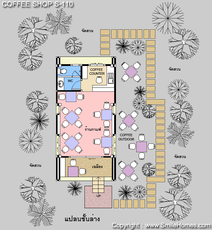 ร้านกาแฟ หรือ Coffee Shop สไตล์ Modern ( สามารถปรับเป็นร้าน Internet Cafe ได้ ) ตัวอาคารยกระดับจากพื้นดิน 1.00 ม. เน้นทางเข้า ด้วยบันไดทางขึ้น มีเฉลียงด้านหน้า ภายในมีส่วนร้านกาแฟแบบโปร่งโล่ง พร้อมระบบ Wi-Fi สำหรับบริการ Internet ให้ลูกค้า มีส่วน Coffee Counter และห้องน้ำที่มีสุขภัณฑ์ครบชุด ด้านข้างเป็นบริเวณจัดสวนที่สามารถจัดเป็นที่นั่งทานกาแฟแบบ Outdoor ได้ ชั้นล่าง