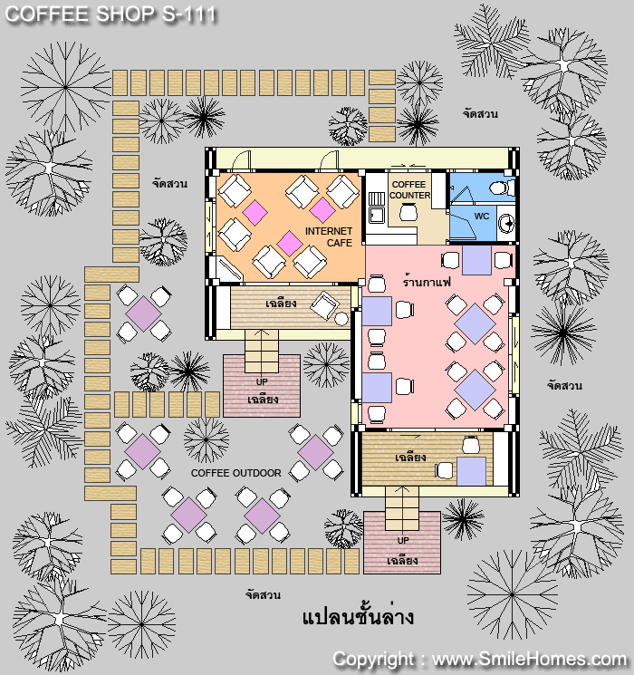 ร้านกาแฟ หรือ Coffee Shop สไตล์ Modern ( สามารถปรับเป็นร้าน Internet Cafe ได้ ) ตัวอาคารยกระดับจากพื้นดิน 1.00 ม. เน้นทางเข้า ด้วยบันไดทางขึ้น มีเฉลียงด้านหน้า ภายในมีส่วนร้านกาแฟแบบโปร่งโล่ง พร้อมระบบ Wi-Fi สำหรับบริการ Internet ให้ลูกค้า มีส่วน Coffee Counter และห้องน้ำที่มีสุขภัณฑ์ครบชุด ด้านข้างเป็นบริเวณจัดสวนที่สามารถจัดเป็นที่นั่งทานกาแฟแบบ Outdoor ได้ ชั้นล่าง