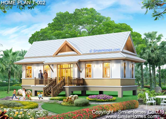 บ้านสไตล์ Modern Thai แบบบ้านอยู่สบาย ใกล้ชิดธรรมชาติ เน้นการประหยัดพลังงาน เป็นบ้านยกระดับจากพื้นดิน 1.20 ม. ใช้เป็นเรือนพักผ่อนในสวน, เรือนริมน้ำ, เรือนรับรอง หรือทำเป็น Resort สำหรับให้เช่าได้ บ้านชั้นเดียว มี 2 ห้องนอน 2 ห้องน้ำ รูปทรงภายนอกสวยงาม สไตล์ไทยประยุกต์ เน้นทางเข้าบ้าน ด้วยบันไดทางขึ้นบ้าน เป็นเฉลียงนั่งเล่น นอกชานขนาดใหญ่ ภายในเป็น ห้องโถงอเนกประสงค์แบบโปร่งโล่ง ใช้เป็นส่วนรับแขก หรือนั่งเล่น ส่วนทานอาหาร มีห้องครัวเป็นสัดส่วน มีห้องนอนที่มีห้องน้ำในตัว 1 ห้อง และห้องนอนขนาดกลางอีก 1 ห้อง และห้องน้ำส่วนกลางที่มีสุขภัณฑ์ครบชุด ชั้นล่าง