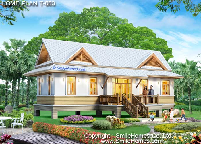 บ้านสไตล์ Modern Thai แบบบ้านอยู่สบาย ใกล้ชิดธรรมชาติ เน้นการประหยัดพลังงาน เป็นบ้านยกระดับจากพื้นดิน 1.20 ม. ใช้เป็นเรือนพักผ่อนในสวน, เรือนริมน้ำ, เรือนรับรอง หรือทำเป็น Resort สำหรับให้เช่าได้ บ้านชั้นเดียว มี 2 ห้องนอน 1 ห้องน้ำ รูปทรงภายนอกสวยงาม สไตล์ไทยประยุกต์ เน้นทางเข้าบ้าน ด้วยบันไดทางขึ้นบ้าน เป็นเฉลียงนั่งเล่น นอกชานขนาดใหญ่ ภายในเป็น ห้องโถงอเนกประสงค์แบบโปร่งโล่ง ใช้เป็นส่วนรับแขก หรือนั่งเล่น ส่วนทานอาหาร มีห้องครัวเป็นสัดส่วน มีห้องนอนขนาดกลาง 2 ห้อง และห้องน้ำส่วนกลางที่มีสุขภัณฑ์ครบชุด ชั้นล่าง