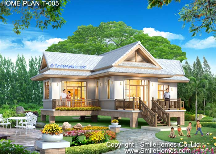 บ้านสไตล์ Modern Thai แบบบ้านอยู่สบาย ใกล้ชิดธรรมชาติ เน้นการประหยัดพลังงาน เป็นบ้านยกระดับจากพื้นดิน 1.20 ม. ใช้เป็นเรือนพักผ่อนในสวน, เรือนริมน้ำ, เรือนรับรอง หรือทำเป็น Resort สำหรับให้เช่าได้ เป็นบ้านชั้นเดียว มี 2 ห้องนอน 1 ห้องน้ำ รูปทรงภายนอกสวยงาม สไตล์ไทยประยุกต์ เน้นทางเข้าบ้าน ด้วยบันไดทางขึ้นบ้าน เป็นเฉลียงนั่งเล่น นอกชานขนาดใหญ่ ภายในเป็น ห้องโถงอเนกประสงค์แบบโปร่งโล่ง ใช้เป็นส่วนนั่งเล่น ส่วนทานอาหาร มีส่วน Pantry เล็กๆ สำหรับเตรียมอาหาร มีห้องนอนขนาดกลาง 2 ห้อง ที่มีระเบียงส่วนตัวด้านนอก และห้องน้ำที่มีสุขภัณฑ์ครบชุด ชั้นล่าง
