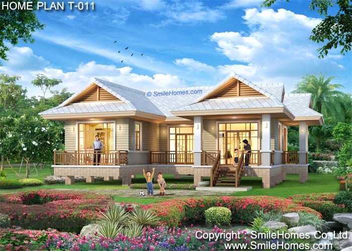 บ้านสไตล์ Modern Thai แบบบ้านอยู่สบาย ใกล้ชิดธรรมชาติ เน้นการประหยัดพลังงาน เป็นบ้านยกระดับจากพื้นดิน 1.20 ม. บ้านชั้นเดียว มี 3 ห้องนอน 2 ห้องน้ำ รูปทรงภายนอกสวยงาม เน้นทางเข้าบ้าน ด้วยบันไดทางขึ้นเฉลียงด้านหน้า ภายในมีส่วนรับแขกโปร่งโล่ง ในบรรยากาศที่เป็นกันเอง ต่อเนื่องกับ ส่วนทานอาหาร ซึ่งมีเฉลียงออกด้านข้างได้ ห้องครัว แยกเป็นสัดส่วน และส่วนซักล้างด้านหลัง มีห้องนอนใหญ่ ที่กว้างขวาง พร้อมห้องน้ำในตัว พร้อมระเบียงส่วนตัวด้านหน้า มีห้องนอนอีก 2 ห้อง และส่วนทางเดินมีเฉลียงนอกชาน เป็นที่นั่งเล่นด้านหน้า ชั้นล่าง