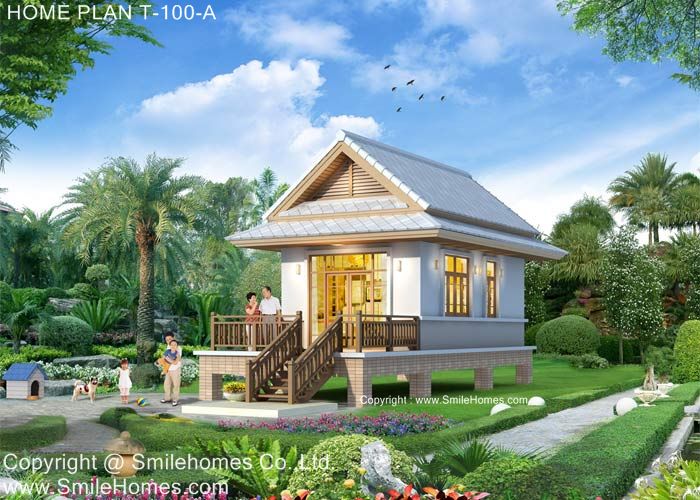 บ้านสไตล์ Modern Thai แบบบ้านอยู่สบาย ใกล้ชิดธรรมชาติ เน้นการประหยัดพลังงาน เป็นบ้านยกระดับจากพื้นดิน 1.20 ม. ใช้เป็นเรือนพักผ่อนในสวน, เรือนริมน้ำ, เรือนรับรอง บ้านพักผู้สูงอายุ หรือทำเป็น Resort สำหรับให้เช่าได้ เป็นบ้านชั้นเดียว มี 1 ห้องนอน 1 ห้องน้ำ รูปทรงภายนอกสวยงาม สไตล์ไทยประยุกต์ เน้นทางเข้าบ้าน ด้วยบันไดทางขึ้นบ้าน เป็นเฉลียงนั่งเล่น นอกชานขนาดใหญ่ ภายในเป็น ห้องโถงอเนกประสงค์แบบโปร่งโล่ง ใช้เป็นส่วนห้องพัก วางเตียงนอนขนาด 6 ฟุต ได้ มีส่วนทานอาหาร ส่วน Pantry เล็กๆ สำหรับเตรียมอาหาร และห้องน้ำที่มีสุขภัณฑ์ครบชุด ชั้นล่าง