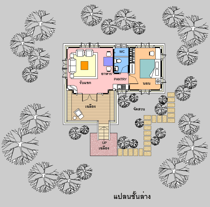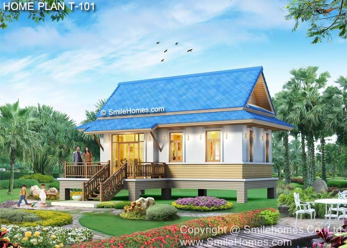 บ้านสไตล์ Modern Thai แบบบ้านอยู่สบาย ใกล้ชิดธรรมชาติ เน้นการประหยัดพลังงาน เป็นบ้านยกระดับจากพื้นดิน 1.20 ม. ใช้เป็นเรือนพักผ่อนในสวน, เรือนริมน้ำ, เรือนรับรอง หรือทำเป็น Resort สำหรับให้เช่าได้ บ้านชั้นเดียว มี 1 ห้องนอน 1 ห้องน้ำ รูปทรงภายนอกสวยงาม สไตล์ไทยประยุกต์ เน้นทางเข้าบ้าน ด้วยบันไดทางขึ้นบ้าน เป็นเฉลียงนั่งเล่น นอกชานขนาดใหญ่ ภายในเป็น ห้องโถงอเนกประสงค์แบบโปร่งโล่ง ใช้เป็นส่วนรับแขก หรือนั่งเล่น ส่วนทานอาหาร มีส่วน Pantry เล็กๆ สำหรับเตรียมอาหาร มีห้องนอน 1 ห้อง และห้องน้ำที่มีสุขภัณฑ์ครบชุด ชั้นล่าง
