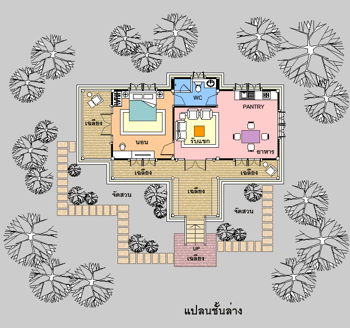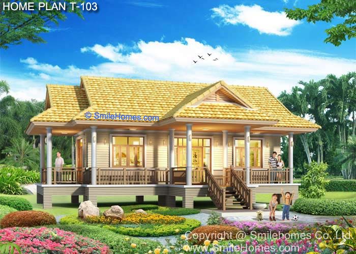 บ้านสไตล์ Modern Thai Resort แบบบ้านอยู่สบาย ใกล้ชิดธรรมชาติ เน้นการประหยัดพลังงาน เป็นบ้านยกระดับจากพื้นดิน 1.20 ม. ใช้เป็นเรือนพักผ่อนในสวน, เรือนริมน้ำ, เรือนรับรอง หรือทำเป็น Resort สำหรับให้เช่าได้ เป็นบ้านชั้นเดียว มี 1 ห้องนอน 1 ห้องน้ำ รูปทรงภายนอกสวยงาม สไตล์ไทยรีสอร์ท เน้นทางเข้าบ้าน ด้วยบันไดทางขึ้น เป็นเฉลียงนั่งเล่น นอกชานขนาดใหญ่ด้านหน้า และถัดไปเป็นเฉลียงยาวตลอด ภายในเป็น ห้องโถงอเนกประสงค์แบบโปร่งโล่ง ใช้เป็นส่วนรับแขกหรือนั่งเล่น มีส่วนทานอาหาร พร้อมส่วน Pantry สำหรับเตรียมอาหาร มีห้องนอน 1 ห้อง ที่มีระเบียงส่วนตัวด้านข้าง และห้องน้ำที่มีสุขภัณฑ์ครบชุด ชั้นล่าง