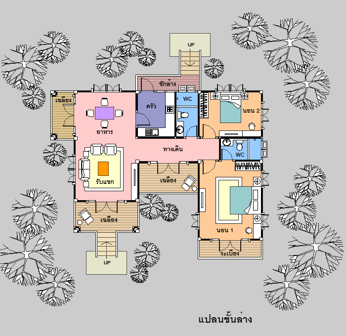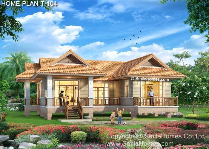 บ้านสไตล์ Modern Thai แบบบ้านอยู่สบาย ใกล้ชิดธรรมชาติ เน้นการประหยัดพลังงาน เป็นบ้านยกระดับจากพื้นดิน 1.20 ม. บ้านชั้นเดียว มี 2 ห้องนอน 2 ห้องน้ำ รูปทรงภายนอกสวยงาม เน้นทางเข้าบ้าน ด้วยบันไดทางขึ้นเฉลียงด้านหน้า ภายในมีส่วนรับแขกโปร่งโล่ง ในบรรยากาศที่เป็นกันเอง ต่อเนื่องกับ ส่วนทานอาหาร ซึ่งมีเฉลียงออกด้านข้างได้ ห้องครัว แยกเป็นสัดส่วน และส่วนซักล้างด้านหลัง มีห้องนอนใหญ่ ที่กว้างขวาง พร้อมห้องน้ำในตัว พร้อมระเบียงส่วนตัวด้านหน้า มีห้องนอนอีก 1 ห้อง และส่วนทางเดินมีเฉลียงนอกชาน เป็นที่นั่งเล่นด้านหน้า ชั้นล่าง