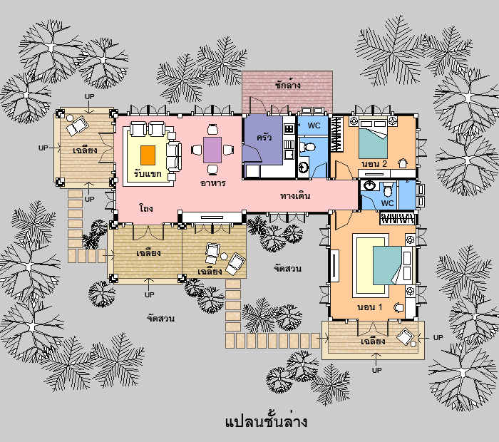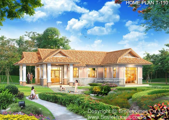 บ้านสไตล์ Modern Thai แบบบ้านอยู่สบาย ใกล้ชิดธรรมชาติ เน้นการประหยัดพลังงาน ใช้เป็นบ้านพักอาศัย, เรือนพักผ่อนในสวน, เรือนริมน้ำ หรือเรือนรับรองได้ เป็นบ้านชั้นเดียว มี 2 ห้องนอน 2 ห้องน้ำ รูปทรงภายนอกสวยงาม เน้นทางเข้าบ้าน ด้วยซุ้มเฉลียงทางเข้า ที่มีหลังคาคลุม มีเฉลียงนั่งเล่น นอกชานขนาดใหญ่ ภายในมีส่วนรับแขกโปร่งโล่ง ต่อเนื่องกับ ส่วนทานอาหาร มีเฉลียงนั่งเล่น ที่ด้านข้างจากห้องรับแขก ห้องครัว แยกเป็นสัดส่วน และส่วนซักล้างด้านหลัง มีห้องนอนใหญ่ ที่กว้างขวาง พร้อมห้องน้ำในตัว และมีเฉลียงส่วนตัว ด้านหน้า มีห้องนอนอีก 1 ห้อง และห้องน้ำส่วนกลาง ใช้ร่วมกับห้องนอน 2 ชั้นล่าง