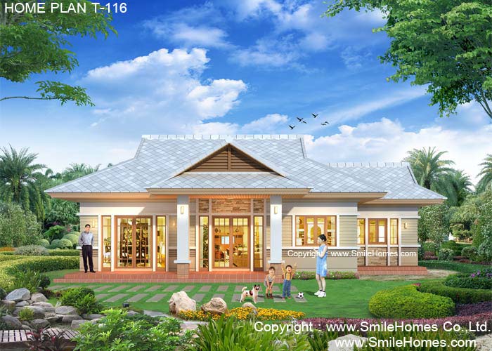 บ้านสไตล์ Thai Contemporary แบบบ้านอยู่สบาย ใกล้ชิดธรรมชาติ เน้นการประหยัดพลังงาน ตัวบ้านยกระดับจากพื้นดิน 50 ซม. เป็นบ้านชั้นเดียว มี 2 ห้องนอน 3 ห้องน้ำ รูปทรงภายนอกสวยงาม เน้นทางเข้าบ้าน ด้วยซุ้มหลังคาด้านหน้าบ้าน ตกแต่งผิวผนังทางเข้าด้วยหินธรรมชาติ ด้านหน้าเป็นเฉลียงนอกชาน นั่งเล่นขนาดใหญ่ ภายในมีส่วนรับแขกโปร่งโล่ง ต่อเนื่องกับส่วนทานอาหาร พร้อมห้องครัว แยกเป็นสัดส่วน มีห้องนอน1 พร้อมห้องน้ำในตัว พร้อมระเบียงส่วนตัวด้านหน้า มีห้องนอน 2 ห้องพร้อมห้องน้ำในตัว และห้องทำงาน ซึ่งสามารถปรับเป็นห้องนอน หรือห้องพระได้ มีห้องเก็บของภายในบ้าน ด้านหลังมีห้องซักรีดและลานซักล้าง ชั้นล่าง