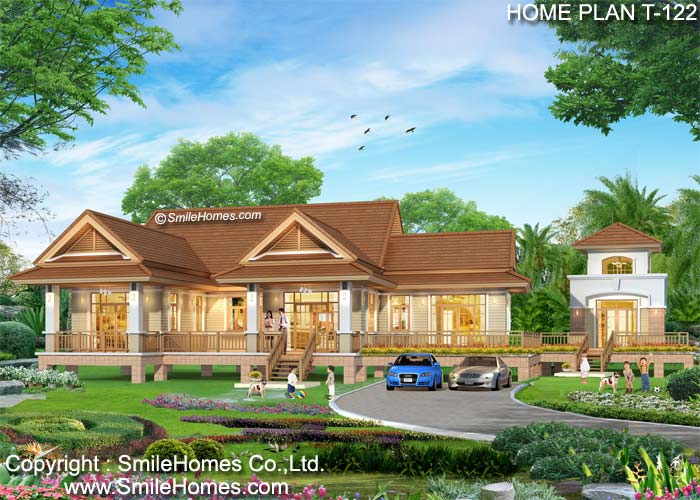 บ้านสไตล์ Modern Thai แบบบ้านอยู่สบาย ใกล้ชิดธรรมชาติ เน้นการประหยัดพลังงาน เป็นบ้านยกระดับจากพื้นดิน 1.20 ม. บ้านชั้นเดียว มี 3 ห้องนอน 4 ห้องน้ำ รูปทรงภายนอกสวยงาม โดดเด่น ด้วยหลังคาเล่นระดับ 2 ชั้น สไตล์ไทยประยุกต์ และห้องรับรองที่มีโดม Sky Light ทางด้านขวา เน้นทางเข้าบ้าน ด้วยซุ้มหลังคาด้านหน้า ตัวบ้านตกแต่งผิวผนังด้วยไม้ฝา Shera ด้านหน้าเป็นเฉลียงนอกชานขนาดใหญ่ ใช้เป็นส่วนนั่งเล่น ส่วนทานอาหาร หรือที่จัดเลี้ยงแบบ Out Door ได้ ภายในมีส่วนรับแขกโปร่งโล่งขนาดใหญ่ ต่อเนื่องกับ ห้องนั่งเล่น ห้องทานอาหารเป็นสัดส่วน พร้อมส่วนเตรียมอาหาร Pantry และห้องครัวไทยภายนอกแบบเปิดโล่ง แบบมีหลังคาคลุม มีห้องนอนใหญ่ทางซ้าย ที่กว้างขวาง พร้อมส่วนแต่งตัวแบบ Walk-In Closet พร้อมห้องน้ำในตัว และเฉลียงส่วนตัวด้านหน้า และห้องนอนใหญ่อีก 2 ห้อง พร้อมห้องน้ำในตัว และห้องน้ำส่วนกลางด้านนอก มีห้องรับรองขนาดใหญ่ ด้านขวา ที่มีโดม Sky Light ด้านบน สูง 5 ม. เป็นส่วนอาคารที่แยกออกมาต่างหาก พร้อมเฉลียงโดยรอบ ชั้นล่าง - ที่จอดรถ 2 คันด้านหน้า แบบเปิดโล่ง ( ขนาด 5.00 x 5.50 ม.)