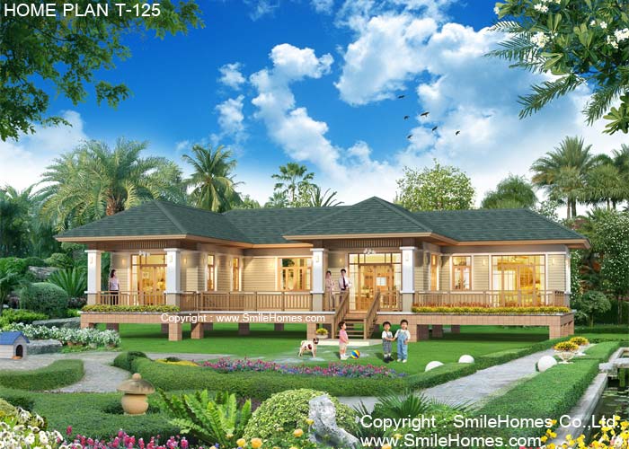 บ้านสไตล์ Thai Contemporary แบบบ้านอยู่สบาย ใกล้ชิดธรรมชาติ เน้นการประหยัดพลังงาน เป็นบ้านยกระดับจากพื้นดิน 1.20 ม. บ้านชั้นเดียว มี 3 ห้องนอน 4 ห้องน้ำ รูปทรงภายนอกสวยงาม เน้นทางเข้าบ้าน ด้วยบันไดทางขึ้นเฉลียงด้านหน้า ตัวบ้านตกแต่งผิวผนังด้วยไม้ฝา Shera ด้านหน้าเป็นเฉลียงนอกชานขนาดใหญ่ ใช้เป็นส่วนนั่งเล่น ส่วนทานอาหาร หรือที่จัดเลี้ยงแบบ Out Door ได้ ภายในมีส่วนรับแขกโปร่งโล่ง ต่อเนื่องกับ ส่วนทานอาหาร มีส่วนเตรียมอาหาร Pantry และห้องครัวไทยภายนอกแบบเปิดโล่ง แบบมีหลังคาคลุม และส่วนซักล้างด้านหลัง มีห้องนอนใหญ่ ที่กว้างขวาง พร้อมห้องน้ำในตัว พร้อมระเบียงใหญ่ส่วนตัวด้านหน้า มีห้องนอน 2 พร้อมห้องน้ำในตัว และห้องนอน 3 พร้อมห้องน้ำในตัว และห้องน้ำส่วนกลาง ชั้นล่าง