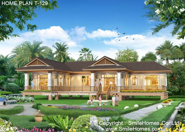 บ้านสไตล์ Modern Thai แบบบ้านอยู่สบาย ใกล้ชิดธรรมชาติ เน้นการประหยัดพลังงาน เป็นบ้านยกระดับจากพื้นดิน 1.20 ม. เหมาะสำหรับนำไปสร้างเป็นบ้านพักตากอากาศ ริมเชิงเขา หรือริมน้ำ : เป็นบ้านชั้นเดียว มี 4 ห้องนอน 4 ห้องน้ำ รูปทรงภายนอกสวยงาม เน้นทางเข้าบ้าน ด้วยบันไดทางขึ้นเฉลียงด้านหน้า ตัวบ้านตกแต่งผิวผนังด้วยไม้ฝา Shera ด้านหน้าเป็นเฉลียงนอกชานขนาดใหญ่ ใช้เป็นส่วนนั่งเล่น ส่วนทานอาหาร หรือที่จัดเลี้ยงแบบ Out Door ได้ ภายในมีส่วนรับแขกโปร่งโล่ง ต่อเนื่องกับ ส่วนทานอาหาร มีส่วนเตรียมอาหาร Pantry และห้องครัวไทยภายนอกแบบเปิดโล่ง มีห้องเก็บของภายใน และส่วนซักล้างด้านหลัง มีห้องนอนใหญ่ ที่กว้างขวาง พร้อมห้องน้ำในตัว พร้อมระเบียงใหญ่ส่วนตัวด้านหน้า มีห้องนอน 2 และห้องนอน 3 พร้อมห้องน้ำในตัว และห้องนอน 4 และห้องน้ำส่วนกลาง ชั้นล่าง