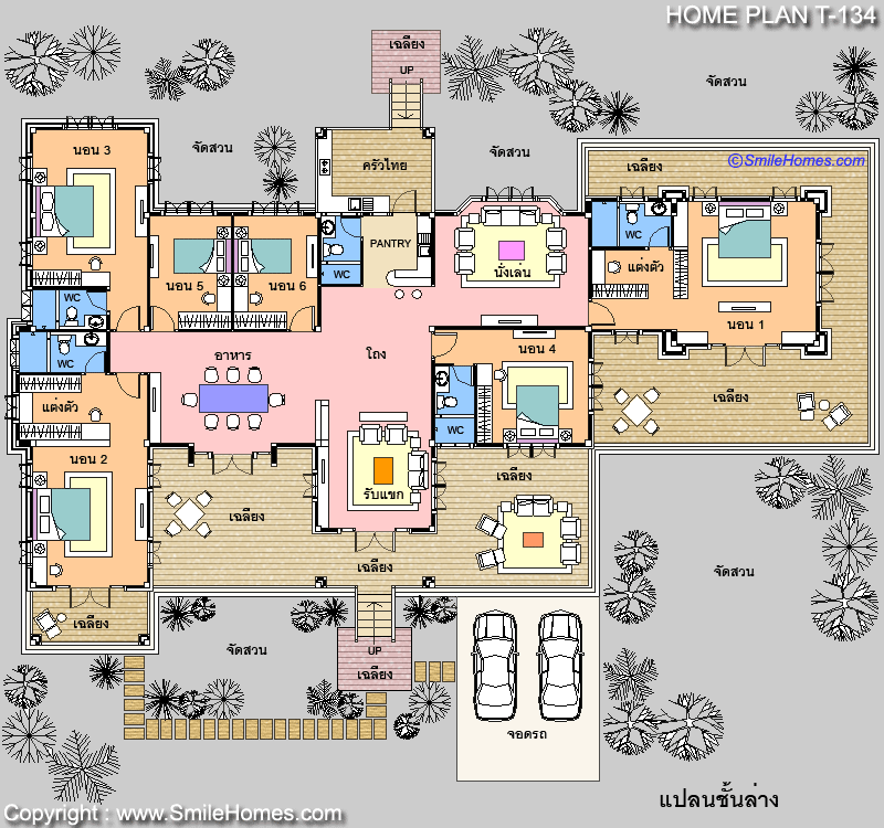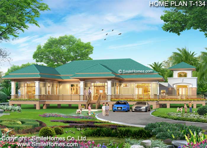 บ้านสไตล์ Contemporary แบบบ้านอยู่สบาย ใกล้ชิดธรรมชาติ เน้นการประหยัดพลังงาน เป็นบ้านยกระดับจากพื้นดิน 1.20 ม. บ้านชั้นเดียว มี 6 ห้องนอน 5 ห้องน้ำ รูปทรงภายนอกสวยงาม โดดเด่น ด้วยหลังคาเล่นระดับ 2 ชั้น และโดม Sky Light ทางซ้าย เน้นทางเข้าบ้าน ด้วยซุ้มหลังคาด้านหน้า ตัวบ้านตกแต่งผิวผนังด้วยไม้ฝา Shera ด้านหน้าเป็นเฉลียงนอกชานขนาดใหญ่ ใช้เป็นส่วนนั่งเล่น ส่วนทานอาหาร หรือที่จัดเลี้ยงแบบ Out Door ได้ ภายในมีส่วนรับแขกโปร่งโล่งขนาดใหญ่ ต่อเนื่องกับ ห้องนั่งเล่น ห้องทานอาหารเป็นสัดส่วน พร้อมส่วนเตรียมอาหาร Pantry และห้องครัวไทยภายนอกแบบเปิดโล่ง แบบมีหลังคาคลุม มีห้องนอนใหญ่ทางขวา ที่กว้างขวาง มียอดโดม Sky Light ด้านบน สูง 5 ม. พร้อมส่วนแต่งตัวแบบ Walk-In Closet พร้อมห้องน้ำในตัว และระเบียงใหญ่ส่วนตัว รอบห้อง และห้องนอนขนาดใหญ่ด้านซ้าย พร้อมส่วนแต่งตัวแบบ Walk-In Closet พร้อมห้องน้ำในตัว และระเบียงส่วนตัวด้านหน้า และห้องนอนขนาดกลาง 1 ห้อง พร้อมห้องน้ำในตัว และห้องนอนสำหรับเด็กอีก 2 ห้อง พร้อมน้ำส่วนกลางด้านนอก ชั้นล่าง - ที่จอดรถ 2 คันด้านหน้า แบบเปิดโล่ง ( ขนาด 5.00 x 5.50 ม.)