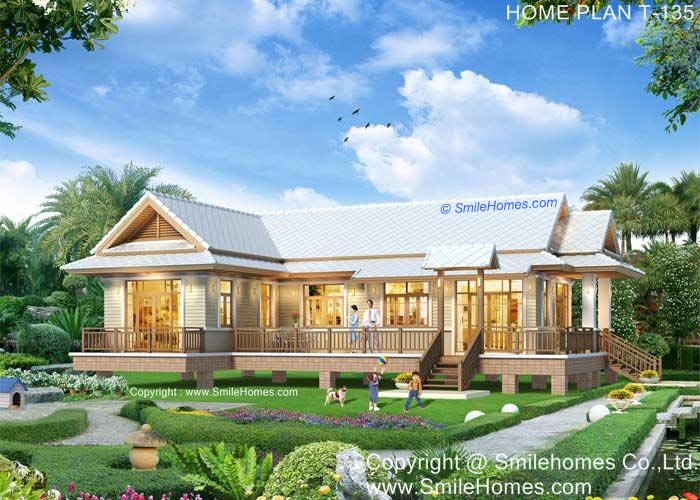 บ้านสไตล์ Modern Thai แบบบ้านอยู่สบาย ใกล้ชิดธรรมชาติ เน้นการประหยัดพลังงาน เป็นบ้านยกระดับจากพื้นดิน 1.20 ม. ใช้เป็นเรือนพักผ่อนในสวน, เรือนริมน้ำ, เรือนรับรอง หรือทำเป็น Resort สำหรับให้เช่าได้ เป็นบ้านชั้นเดียว มี 2 ห้องนอน 2 ห้องน้ำ รูปทรงภายนอกสวยงาม เน้นทางเข้าบ้าน ด้วยบันไดทางขึ้น ที่มีซุ้มทางเข้า มีเฉลียงนั่งเล่น นอกชานขนาดใหญ่ด้านหน้า ภายในมีส่วนรับแขกโปร่งโล่ง ต่อเนื่องกับ ส่วนทานอาหาร มีเฉลียงออกด้านข้างจากห้องรับแขก ห้องครัว แยกเป็นสัดส่วน และส่วนซักล้างด้านหลัง มีห้องนอนใหญ่ ที่กว้างขวาง พร้อมห้องน้ำในตัว พร้อมระเบียงส่วนตัวด้านหน้า มีห้องนอนอีก 1 ห้อง และห้องน้ำส่วนกลาง ชั้นล่าง