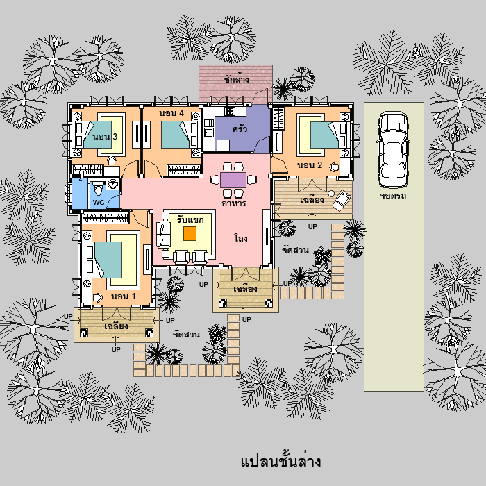 บ้านสไตล์ Contemporary แบบบ้านอยู่สบาย ใกล้ชิดธรรมชาติ เน้นการประหยัดพลังงาน ตัวบ้านยกระดับจากพื้นดิน 50 ซม. บ้านชั้นเดียว มี 4 ห้องนอน 1 ห้องน้ำ รูปทรงภายนอกสวยงาม เน้นทางเข้าบ้าน ด้วยซุ้มหลังคาทางเข้าเฉลียง ด้านหน้าบ้าน ตัวบ้านตกแต่งผิวผนังด้วยไม้ฝา Shera ภายในมีส่วนรับแขกโปร่งโล่ง ต่อเนื่องกับ ส่วนทานอาหาร พร้อมห้องครัว แยกเป็นสัดส่วน และส่วนซักล้างด้านหลัง มีห้องนอนใหญ่ พร้อมเฉลียงส่วนตัวด้านหน้า , ห้องนอน 2 พร้อมเฉลียงนั่งเล่นนอกชานด้านหน้า และห้องนอนสำหรับเด็กอีก 2 ห้อง พร้อมห้องน้ำที่มีสุขภัณฑ์ครบชุด ชั้นล่าง