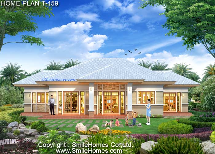 | แบบบ้านชั้นเดียว T-159 3 ห้องนอน 3 ห้องน้ำ พื้นที่ใช้สอย 218 ตร.ม. ขนาดตัวบ้านกว้าง 21.70 ม. ลึก 14.20 ม. ที่ดินขนาด 120 ตร.ว.ขึ้นไป ค่าก่อสร้างประมาณ 2.6 - 3.3 ล้านบาท ค่าแบบพิมพ์เขียว 5 ชุดพิเศษ 39,900 บาท ( จากราคาปกติ 80,000 บาท) ค่าจัดส่งฟรี |