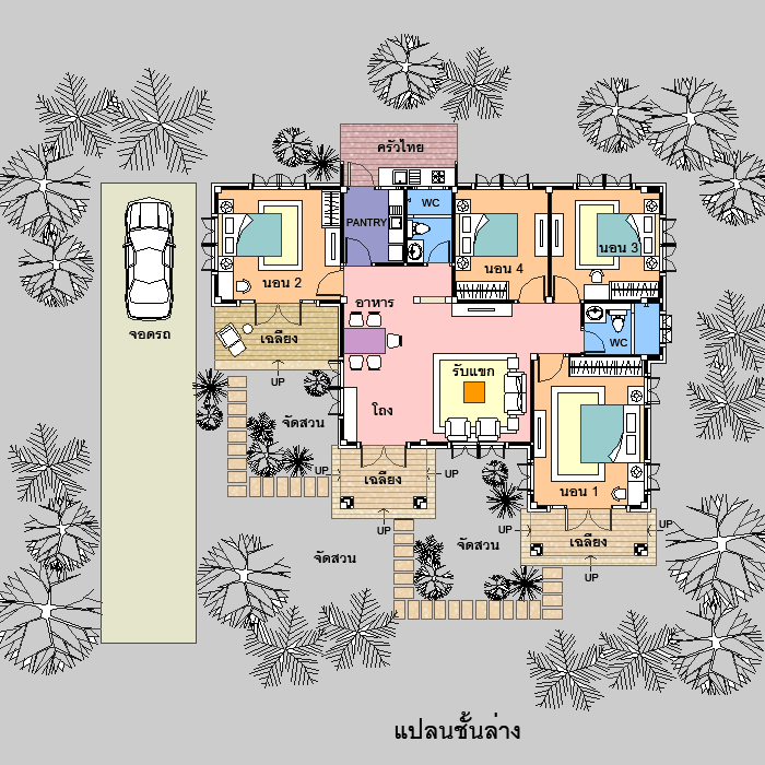 บ้านสไตล์ Contemporary แบบบ้านอยู่สบาย ใกล้ชิดธรรมชาติ เน้นการประหยัดพลังงาน ตัวบ้านยกระดับจากพื้นดิน 50 ซม. บ้านชั้นเดียว มี 4 ห้องนอน 2 ห้องน้ำ ที่จอดรถ 1 คัน รูปทรงภายนอกสวยงาม เน้นทางเข้าบ้าน ด้วยซุ้มหลังคาทางเข้าเฉลียง ด้านหน้าบ้าน ตัวบ้านตกแต่งผิวผนังด้วยไม้ฝา Shera ภายในมีส่วนรับแขกโปร่งโล่ง ต่อเนื่องกับ ส่วนทานอาหาร พร้อมห้อง Pantry สำหรับเตรียมอาหาร มีส่วนครัวไทยด้านนอก แยกเป็นสัดส่วน มีห้องนอนใหญ่ พร้อมเฉลียงส่วนตัวด้านหน้า , ห้องนอน 2 พร้อมเฉลียงนั่งเล่นนอกชานด้านหน้า และห้องนอนสำหรับเด็กอีก 2 ห้อง พร้อมห้องน้ำ 2 ห้อง ที่มีสุขภัณฑ์ครบชุด ชั้นล่าง