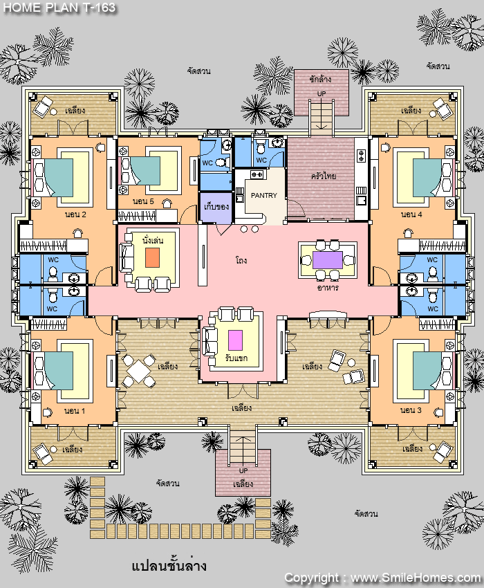 | แบบบ้านชั้นเดียว T-163 5 ห้องนอน 6 ห้องน้ำ พื้นที่ใช้สอย 327 ตร.ม. ตัวบ้านกว้าง 21.20 ม. ลึก 17.70 ม. ที่ดินขนาด 137 ตร.ว.ขึ้นไป ค่าก่อสร้างประมาณ 3.9 - 4.9 ล้านบาท ค่าแบบพิมพ์เขียว 5 ชุดพิเศษ 49,900 บาท ( จากราคาปกติ 100,000 บาท) ค่าจัดส่งฟรี |