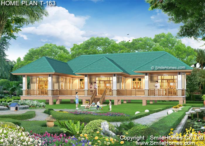 บ้านสไตล์ Modern Thai แบบบ้านอยู่สบาย ใกล้ชิดธรรมชาติ เน้นการประหยัดพลังงาน เป็นบ้านยกระดับจากพื้นดิน 1.20 ม. บ้านชั้นเดียว มี 5 ห้องนอน 6 ห้องน้ำ รูปทรงภายนอกสวยงาม เน้นทางเข้าบ้าน ด้วยบันไดทางขึ้นเฉลียงด้านหน้า ตัวบ้านตกแต่งผิวผนังด้วยไม้ฝา Shera ด้านหน้าเป็นเฉลียงนอกชาน นั่งเล่นขนาดใหญ่ ภายในมีส่วนรับแขกโปร่งโล่ง ต่อเนื่องกับ ส่วนทานอาหาร มีห้องนั่งเล่น ส่วนเตรียมอาหาร Pantry และห้องครัวไทยภายนอกแบบเปิดโล่ง มีหลังคาคลุม มีห้องเก็บของ และส่วนซักล้างด้านหลัง มีห้องนอนขนาดใหญ่ 4 ห้อง พร้อมห้องน้ำในตัว พร้อมเฉลียงส่วนตัวด้านหน้า มีห้องนอนใหญ่ขนาดกลางอีก 1 ห้อง พร้อมห้องน้ำในตัว มีห้องเก็บของ และห้องน้ำส่วนกลางภายนอก ชั้นล่าง