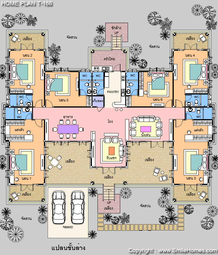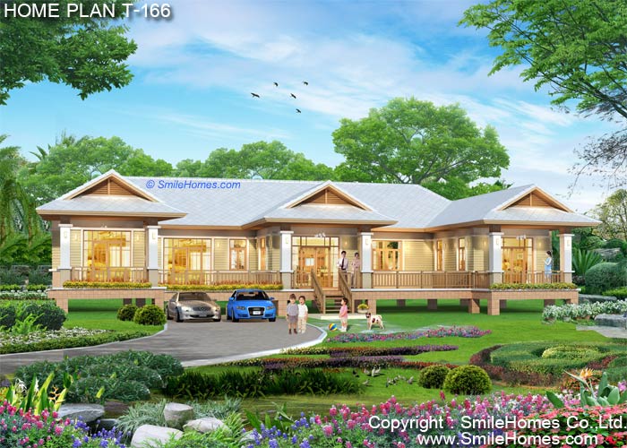 บ้านสไตล์ Modern Thai แบบบ้านอยู่สบาย ใกล้ชิดธรรมชาติ เน้นการประหยัดพลังงาน เป็นบ้านยกระดับจากพื้นดิน 1.20 ม. บ้านชั้นเดียว มี 6 ห้องนอน 7 ห้องน้ำ รูปทรงภายนอกสวยงาม เน้นทางเข้าบ้าน ด้วยซุ้มหลังคาด้านหน้า ตัวบ้านตกแต่งผิวผนังด้วยไม้ฝา Shera ด้านหน้าเป็นเฉลียงนอกชานขนาดใหญ่ ใช้เป็นส่วนนั่งเล่น ส่วนทานอาหาร หรือที่จัดเลี้ยงแบบ Out Door ได้ ภายในมีส่วนรับแขกโปร่งโล่งขนาดใหญ่ ต่อเนื่องกับ ส่วนทานอาหาร และห้องนั่งเล่นขนาดใหญ่ มีส่วนเตรียมอาหาร Pantry และห้องครัวไทยภายนอก แบบเปิดโล่ง มีหลังคาคลุม มีห้องนอนใหญ่ 2 ห้อง พร้อมส่วนแต่งตัวแบบ Walk-In Closet และห้องน้ำในตัว มีเฉลียงส่วนตัวด้านหน้า และห้องนอนขนาดกลางอีก 4 ห้อง พร้อมห้องน้ำในตัว และห้องน้ำส่วนกลาง ชั้นล่าง