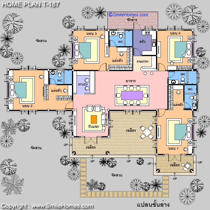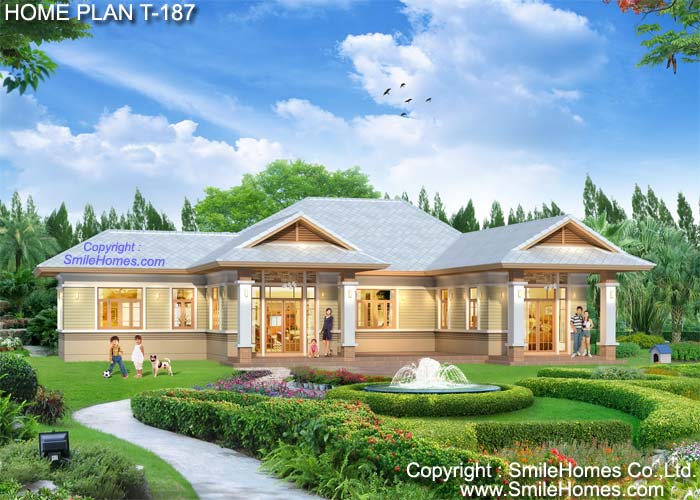 | แบบบ้านชั้นเดียว T-187 4 ห้องนอน 4 ห้องน้ำ พื้นที่ใช้สอย 252 ตร.ม. ขนาดตัวบ้านกว้าง 21.50 ม. ลึก 16.20 ม. ที่ดินขนาด 130 ตร.ว.ขึ้นไป ค่าก่อสร้างประมาณ 2.9 - 3.9 ล้านบาท ค่าแบบพิมพ์เขียว 5 ชุดพิเศษ 44,900 บาท ( จากราคาปกติ 90,000 บาท) ค่าจัดส่งฟรี |