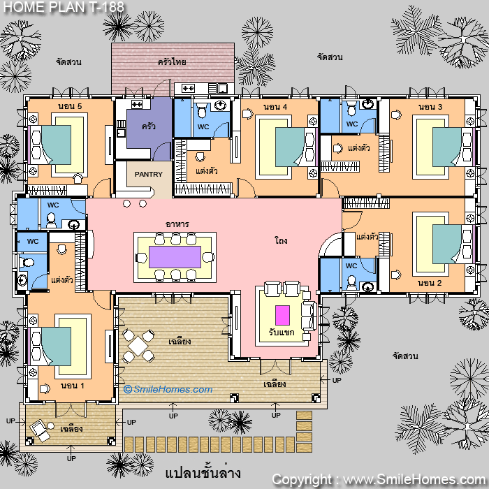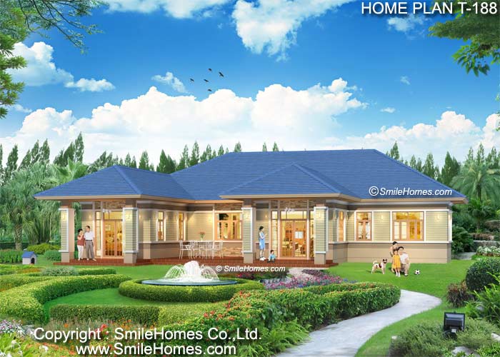 | แบบบ้านชั้นเดียว T-188 5 ห้องนอน 5 ห้องน้ำ พื้นที่ใช้สอย 287 ตร.ม. ขนาดตัวบ้านกว้าง 21.70 ม. ลึก 16.30 ม. ที่ดินขนาด 130 ตร.ว.ขึ้นไป ราคาค่าก่อสร้างประมาณ 3.4 - 4.4 ล้านบาท ค่าแบบพิมพ์เขียว 5 ชุดพิเศษ 34,900 บาท ( จากราคาปกติ 100,000 บาท) ค่าจัดส่งฟรี |