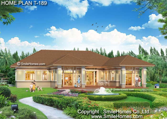 | แบบบ้านชั้นเดียว T-189 5 ห้องนอน 6 ห้องน้ำ พื้นที่ใช้สอย 315 ตร.ม. ขนาดตัวบ้านกว้าง 21.70 ม. ลึก 19.80 ม. ที่ดินขนาด 155 ตร.ว.ขึ้นไป ค่าก่อสร้างประมาณ 3.8 - 4.8 ล้านบาท ค่าแบบพิมพ์เขียว 5 ชุดพิเศษ 39,900 บาท ( จากราคาปกติ 100,000 บาท) ค่าจัดส่งฟรี |