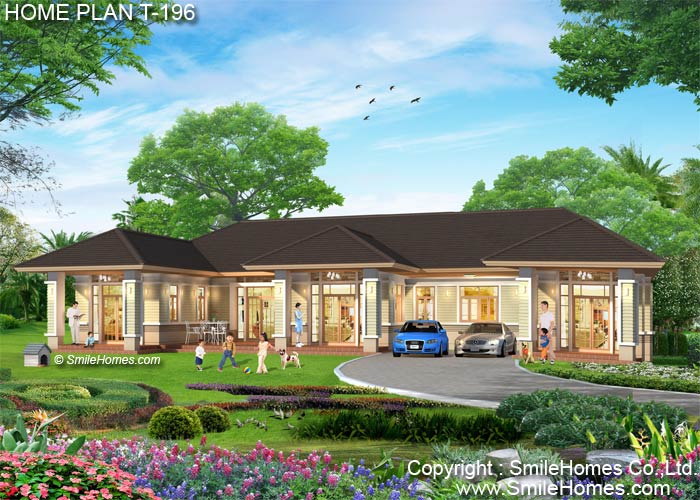 บ้านสไตล์ Thai Contemporary แบบบ้านอยู่สบาย ใกล้ชิดธรรมชาติ เน้นการประหยัดพลังงาน เป็นบ้านยกระดับจากพื้นดิน 0.50 ม. บ้านชั้นเดียว มี 6 ห้องนอน 7 ห้องน้ำ รูปทรงภายนอกสวยงาม ด้วยหลังคา 2 ชั้น เน้นทางเข้าบ้าน ด้วยซุ้มหลังคาด้านหน้า ตัวบ้านตกแต่งผิวผนังด้วยไม้ฝา Shera ด้านหน้าเป็นเฉลียงนอกชานขนาดใหญ่ ใช้เป็นส่วนนั่งเล่น ส่วนทานอาหาร หรือที่จัดเลี้ยงแบบ Out Door ได้ ภายในมีส่วนรับแขกโปร่งโล่งขนาดใหญ่ ต่อเนื่องกับ ส่วนทานอาหาร และห้องนั่งเล่นขนาดใหญ่ มีส่วนเตรียมอาหาร Pantry และห้องครัวไทยภายนอกแบบเปิดโล่ง มีหลังคาคลุม มีห้องนอนใหญ่ 2 ห้อง พร้อมส่วนแต่งตัวแบบ Walk-In Closet และห้องน้ำในตัว มีเฉลียงส่วนตัวด้านหน้า และห้องนอนขนาดกลางอีก 4 ห้อง พร้อมห้องน้ำในตัว และห้องน้ำส่วนกลาง ชั้นล่าง