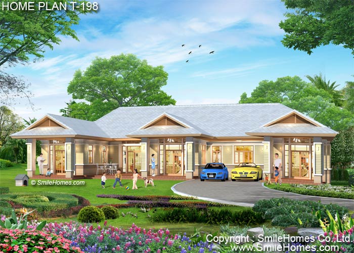 บ้านสไตล์ Thai Contemporary แบบบ้านอยู่สบาย ใกล้ชิดธรรมชาติ เน้นการประหยัดพลังงาน เป็นบ้านยกระดับจากพื้นดิน 0.50 ม. บ้านชั้นเดียว มี 6 ห้องนอน 7 ห้องน้ำ รูปทรงภายนอกสวยงาม โดดเด่น เน้นทางเข้าบ้าน ด้วยซุ้มหลังคาด้านหน้า มีเฉลียงนอกชานขนาดใหญ่ด้านหน้า ใช้เป็นส่วนนั่งเล่น ส่วนทานอาหาร หรือที่จัดเลี้ยงแบบ Out Door ได้ ตัวบ้านตกแต่งผิวผนังด้วยไม้ฝา Shera ภายในมีส่วนโถงรับแขกโปร่งโล่ง ต่อเนื่องกับ ส่วนทานอาหาร มีห้องนั่งเล่นขนาดใหญ่ พร้อมส่วนเตรียมอาหาร Pantry และครัวไทย แบบเปิดโล่ง มีหลังคาคลุมด้านนอก มีห้องนอนขนาดใหญ่ 4 ห้อง พร้อมส่วนแต่งตัวแบบ Walk-In Closet พร้อมห้องน้ำในตัว และห้องนอนขนาดกลางอีก 2 ห้อง พร้อมห้องน้ำในตัว และห้องน้ำส่วนกลาง ชั้นล่าง